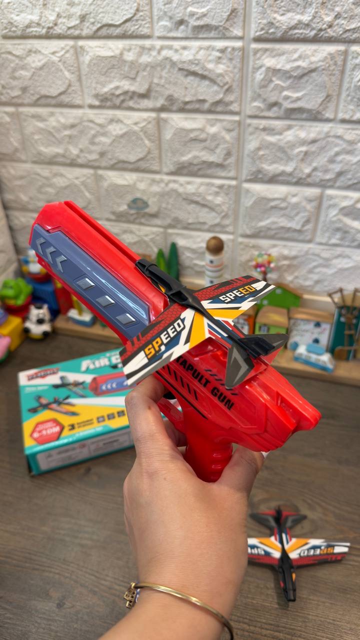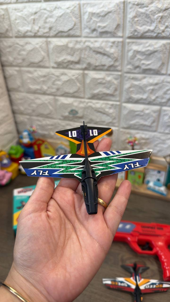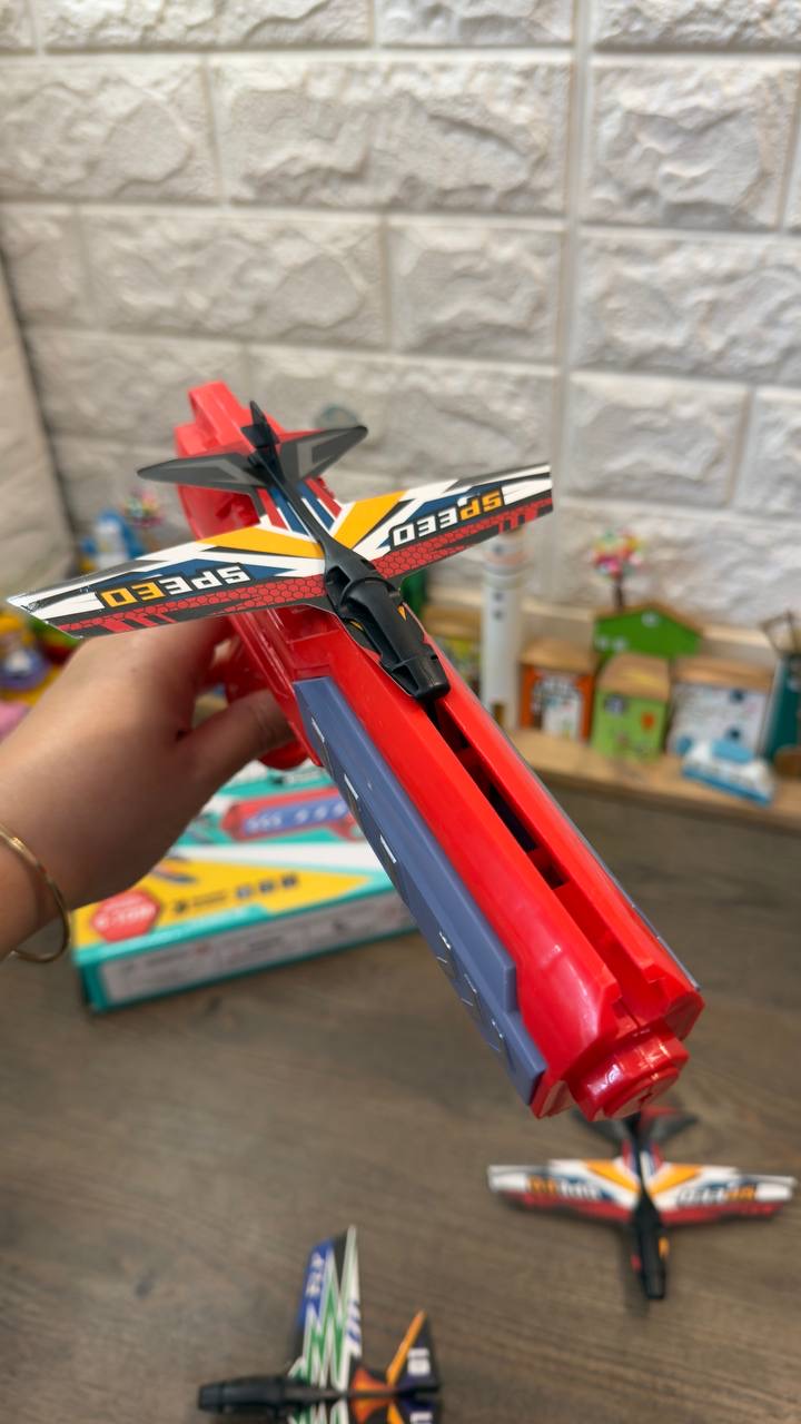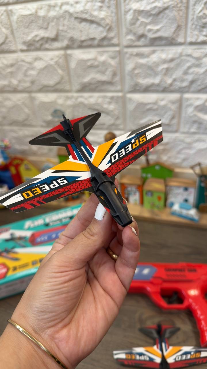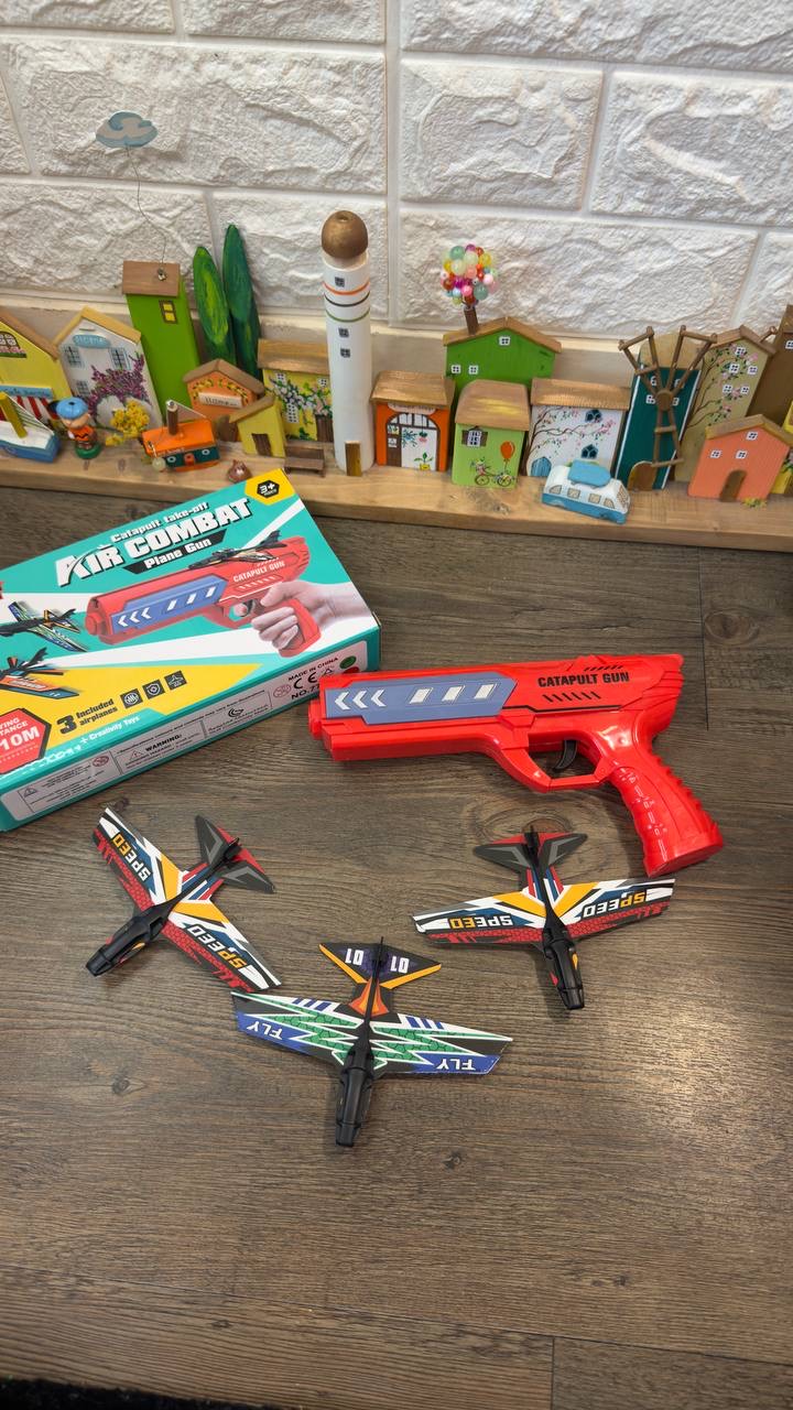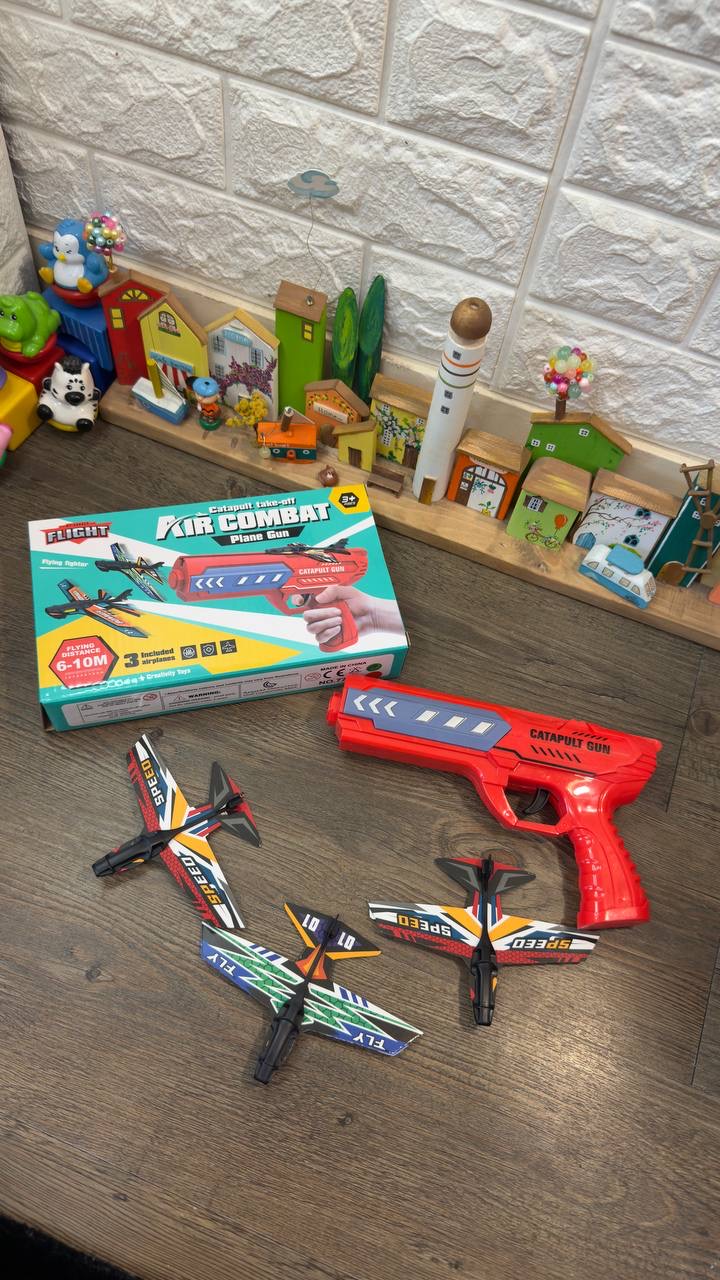 هواپیما تفنگی تفنگ و سه تا هواپیما و دوتا هم یدکی هواپیما ،هواپیما روی تفنگ میشینه و تو فضای باز ۶ تا ۱۰ متر پرواز میکنه خیلی مفرح و سرگرم کننده ست