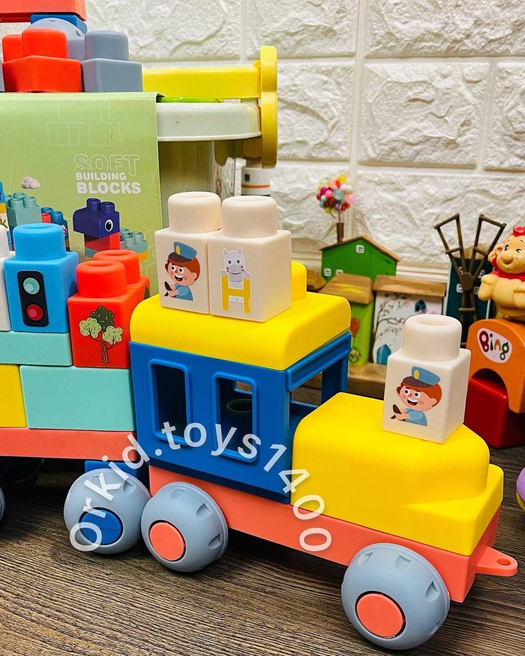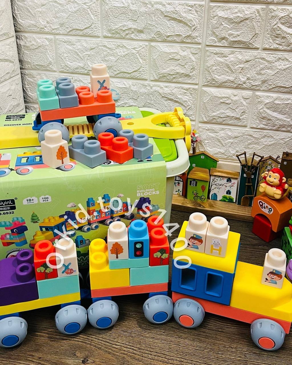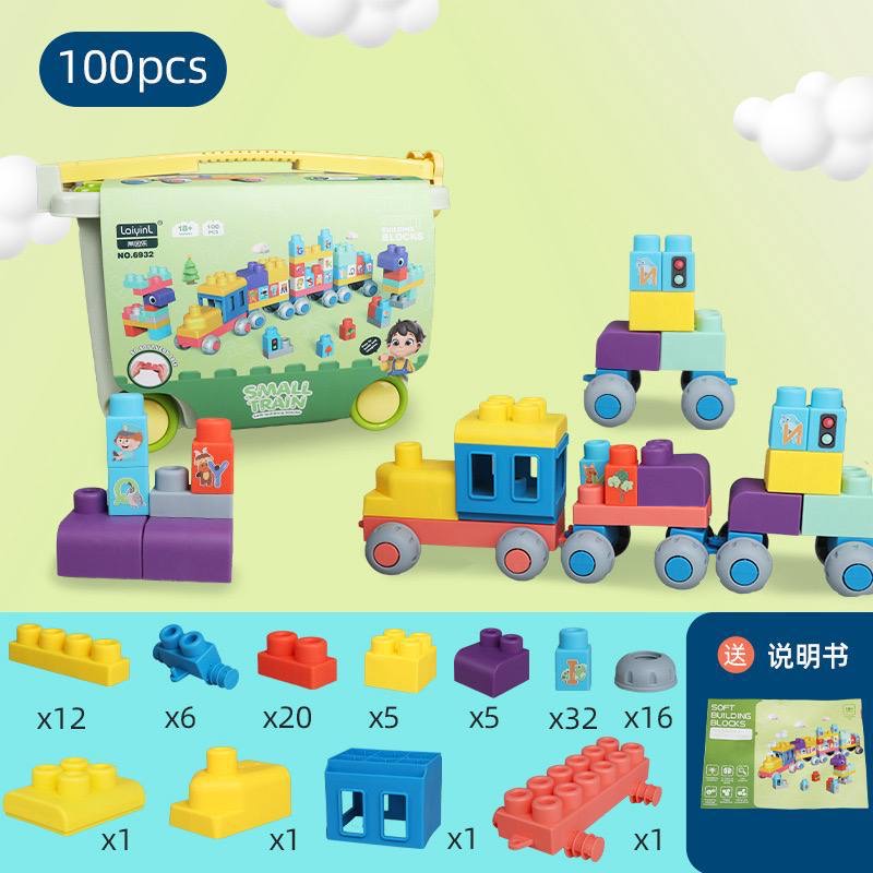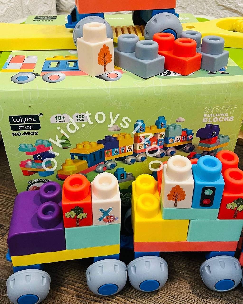 لگو نرم یا لگو سافت ِ باکسدارِ صد تاییباکسش زیرش چرخ داره و دسته داره که بچه میتونه دنبال خودش بکشهسایز قطعات بزرگِ اجره هستش و روشون برچسب چاپی دارهنرم و معطف هستن و از ۱۸ ماه برای استفاده کاملا مناسبن