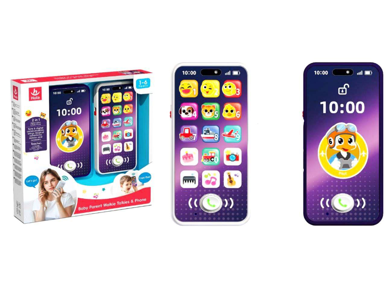 ست موبایل و واکی تاکیِ هولا قابل استفاده به عنوان موبایل تک و موزیکال با صفحه ی تمام لمسی و آموزش اعداد و حیوانات و …و یه بیسیم همراه که به اولی وصل میشه و قابلیت استفاده به صورت واکی تاکی رو پیدا میکنه با برد ۱۰۰ متری عالی ونشکن