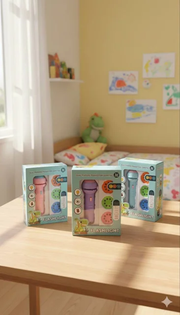 چراغ قوه سه نگاتیو جعبه دار با طراحی کاربردی و جذاب، مجهز به باتری با دوام، مناسب برای کودکان جهت رفع ترس از تاریکی، سبک و قابل حمل، ایدهآل برای استفاده سرگرمی در محیطهای تاریک.